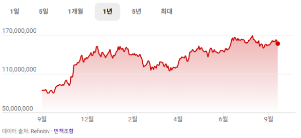 한편, 비트코인의 52주 최고가는 1억 6990만 원(2025년 8월 14일), 최저가는 8063만 원(2024년 10월 10일)으로, 현재 시세는 고점 대비 약 6%가량 낮은 수준이다. 거래량은 24시간 기준 약 2314 BTC, 거래대금은 약 3716억 원에 달하며 여전히 활발한 거래가 이어지고 있다.
