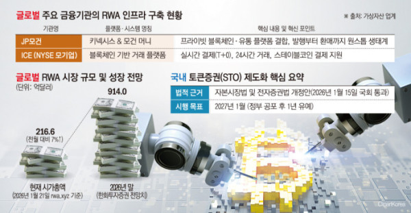 글로벌 실물자산 토큰화(RWA) 시장이 빠르게 성장하는 가운데 자산 활용 방식도 변화했다. ‘유통형 RWA’가 확대되면서 이를 제도권 금융 인프라로 수용하기 위한 토큰증권(STO) 체계 구축이 주요 과제로 부상했다. 글로벌 거래소는 24시간 거래를 내세운 인프라 경쟁에 나섰는데 국내는 아직 법제화 논의 단계에 머물러 있다.